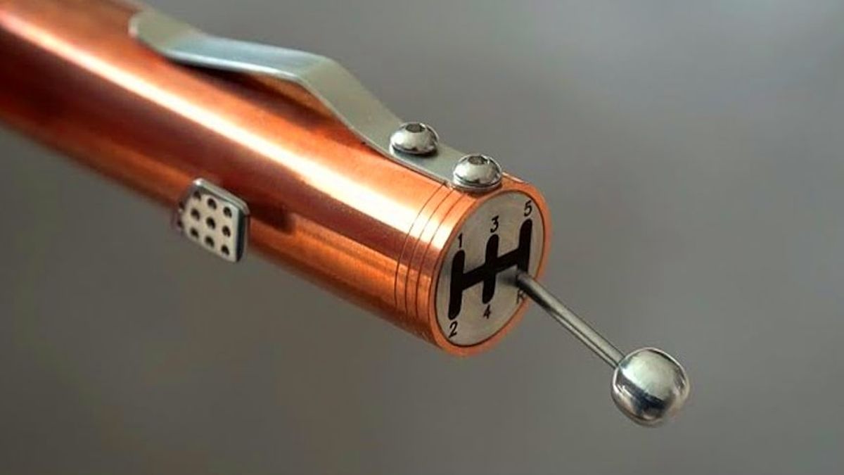 Páka manuální převodovky od Maker B je kompletně zakázková výroba s použitím materiálů, jako je měď a hliník. Vnitřní funkce je podobná originálním propiskám z minulosti, ale tvůrce svému výtvoru dodal jedinečný nádech tím, že jej vymodeloval podle automobilové manuální řadicí páky s funkčním spojkovým pedálem.
