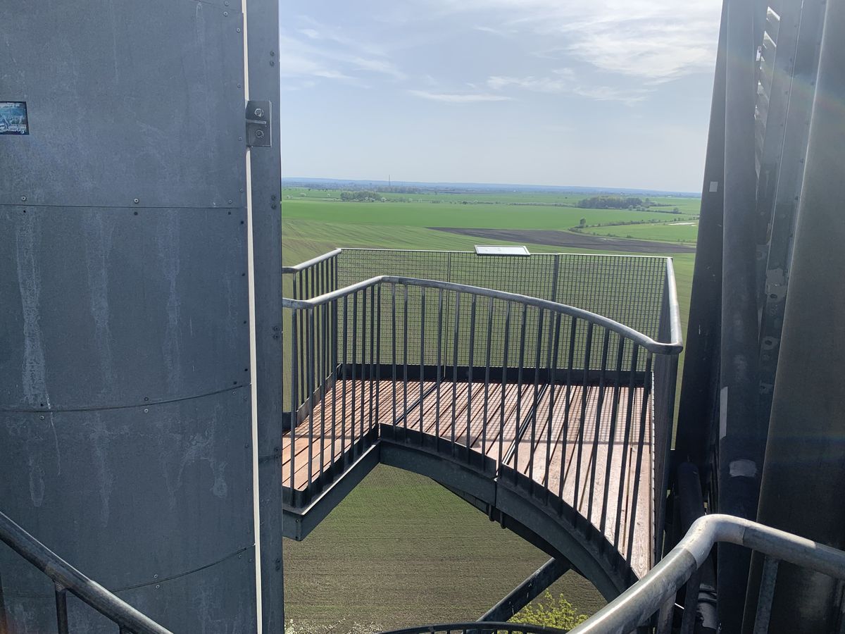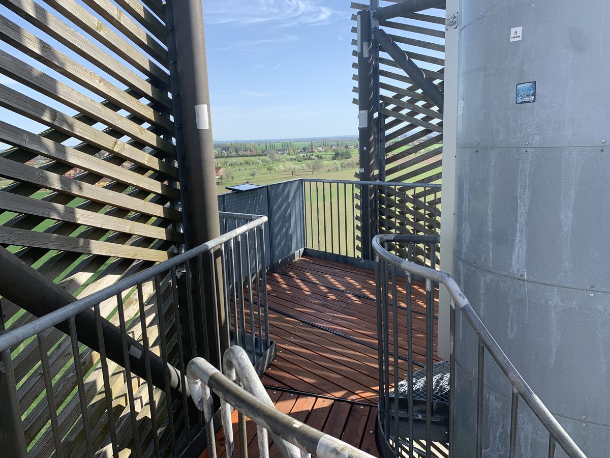 Rozhledna se skládá ze zemního valu, ve kterém je umístěno zázemí vysílače, gabionové stěny a betonového sloupu, který obepíná dřevem obložená ocelová konstrukce se schodištěm a několika vyhlídkovými plošinami. Příhradová rozhledna je vysoká 50 metrů a stojí na uměle vytvořeném kopci. Na nejvyšší plato rozhledny, ve výšce 26 metrů, vede 116 schodů. Konstrukce je navržena tak, aby efektivně plnila dvojí funkci – slouží jako nosič telekomunikačního zařízení pro tři mobilní operátory a zároveň poskytuje veřejnosti přístup k vyhlídkovým plošinám. Zajímavostí je, že pod budoucí rozhlednu musel být nejprve navezen „umělý“ kopec, aby bylo z rozhledny dobře vidět. Toto technické řešení bylo nutné kvůli rovinaté povaze okolní krajiny a umožnilo architektům vytvořit funkční vyhlídku i v tomto netradičním prostředí.