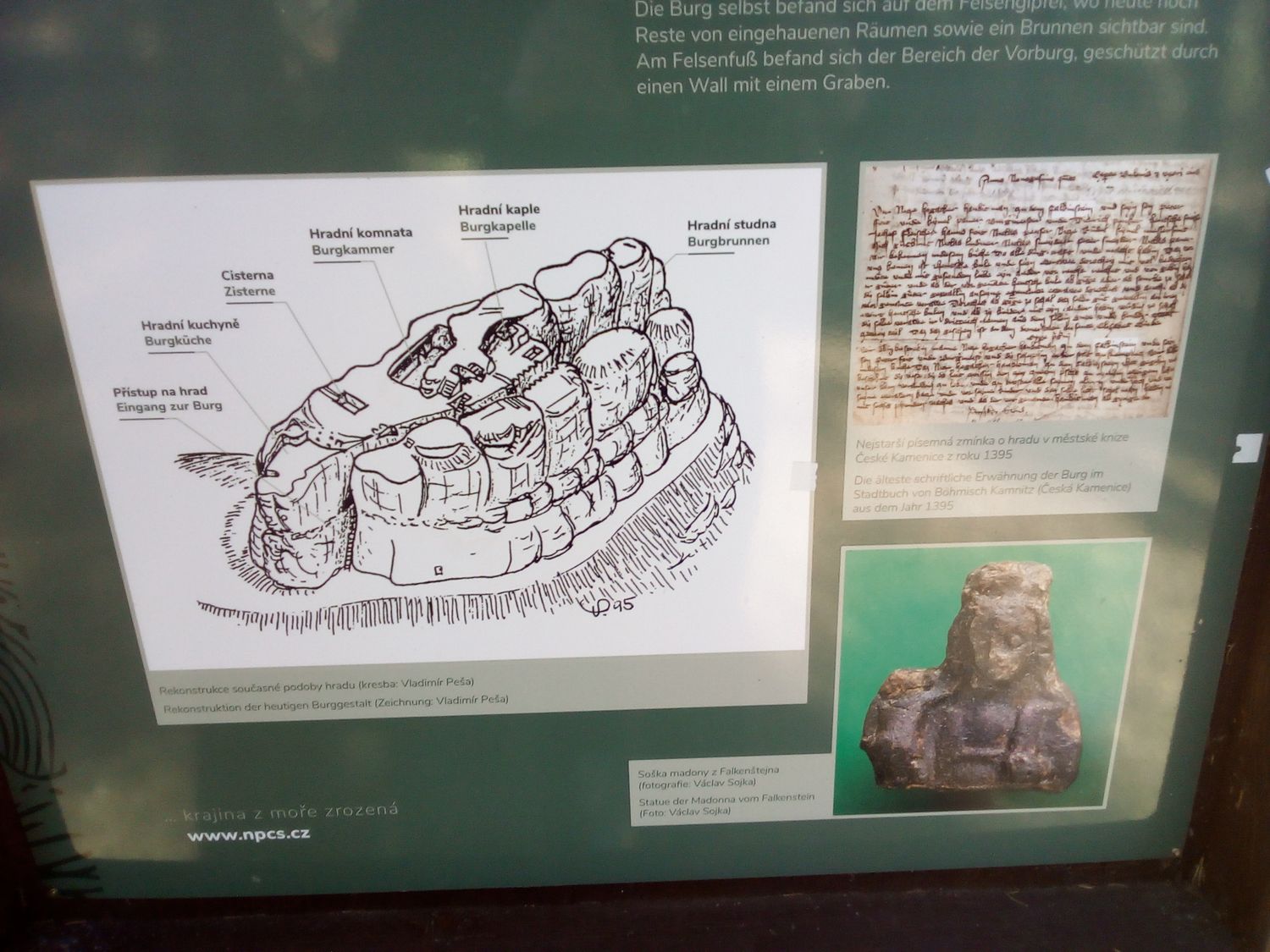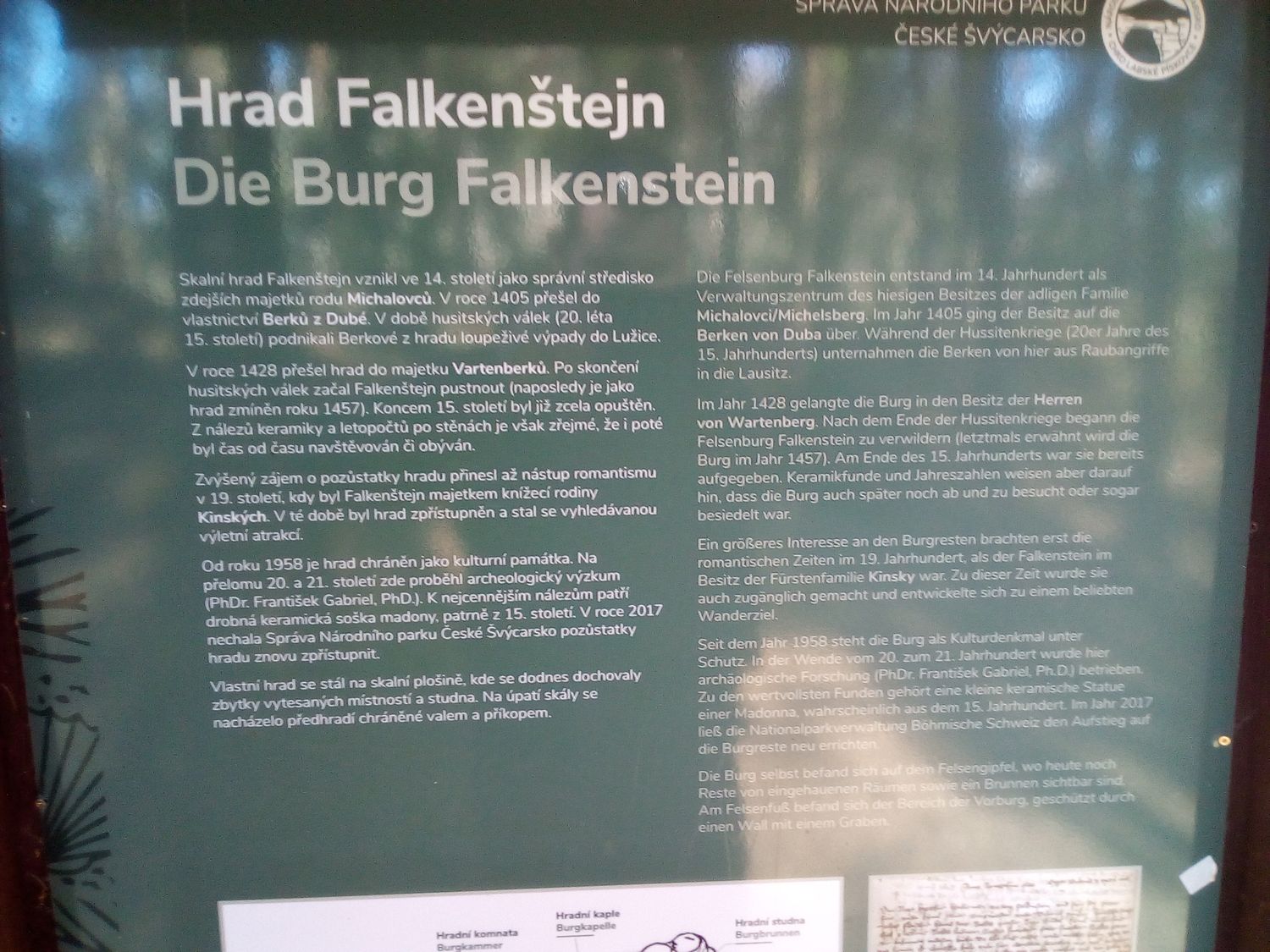 Na vrcholu můžete zřetelně vidět zbytky hradu, od studny až po různé místnosti, vše je přehledně popsané.