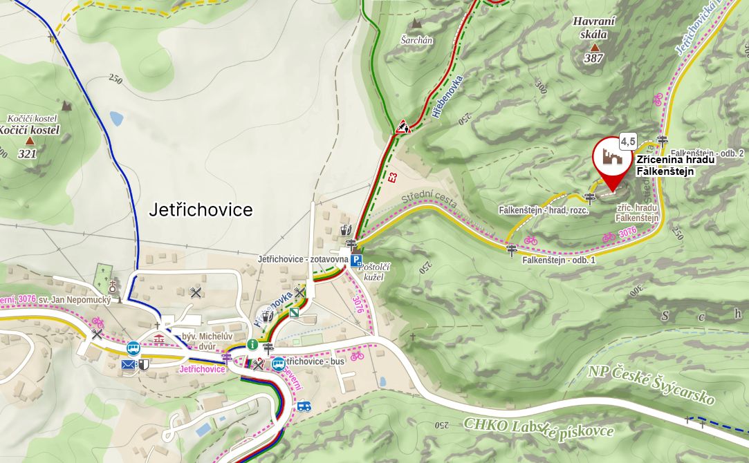 Falkenštejn se nachází přibližně kilometr od obce Jetřichovice, což z něj činí snadno dostupný cíl pro jednodenní výlety. Skalní hrad Falkenštejn naleznete nedaleko obce Jetřichovice v srdci NP České Švýcarsko. Blízkost Národního parku České Švýcarsko nabízí možnost kombinovat návštěvu hradu s dalšími přírodními a kulturními zajímavostmi regionu. Turisté mohou spojit návštěvu Falkenštejna s prohlídkou dalších atrakcí Českého Švýcarska, jako jsou Pravčická brána, Bastei, soutěsky Kamenice nebo jiné skalní hrady regionu. Tato koncentrace zajímavostí činí z oblasti jeden z nejatraktivnějších turistických regionů České republiky.