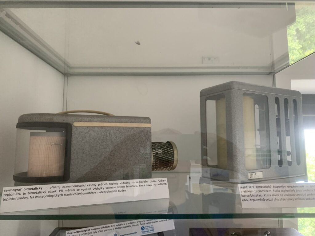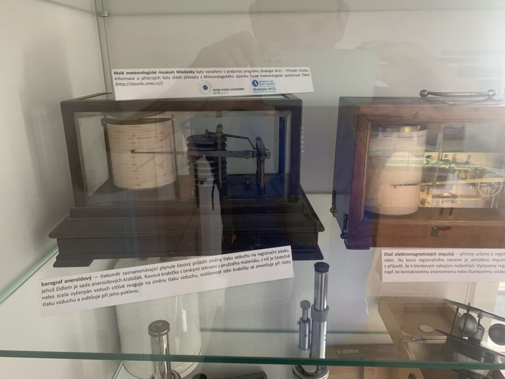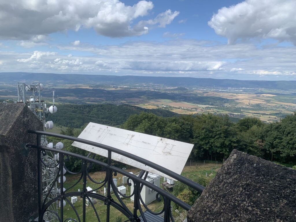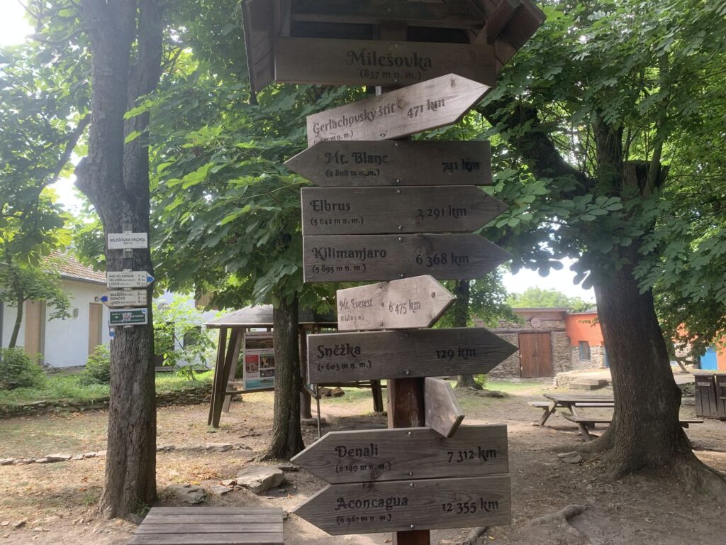 Milešovka je známá také jako Hromová hora a je největrnější horou v České republice s nejvíce bouřemi. K napočítání úplně bezvětrných dní v roce stačí prsty obou rukou a vítr se zde mnohdy prohání rychlostí více než 100 km v hodině. Kuželovitý tvar hory způsobuje, že naměřené hodnoty meteorologických prvků nejsou ovlivňovány stoupajícími větry, které horu většinou obtékají. Tato specifická topografická poloha činí z Milešovky ideální místo pro meteorologická pozorování a výzkum atmosférických jevů. Nahoře narazíte na tento skvělý rozcestník, který vám ukazuje vzdálenost i směr k různých zajímavým místům ve světě, jako je Mt. Everest nebo Elbrus.